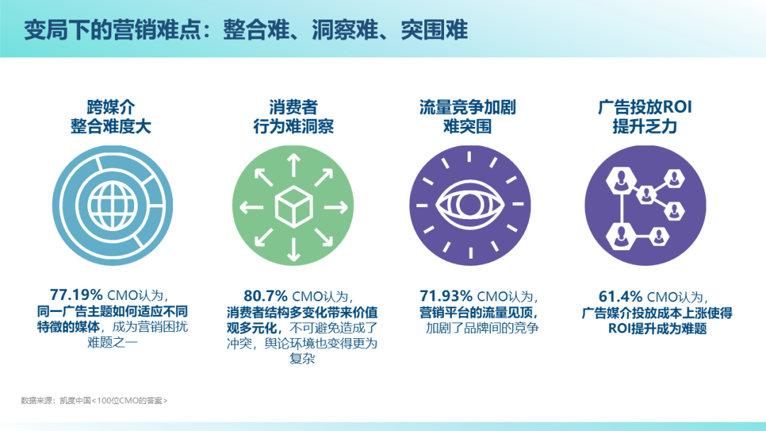 与此同时,政府出台的反垄断政策,促进平台间壁垒逐步被打破,全域营销时代已全面到来。然而,跨媒介整合难度大、消费者行为难洞察、流量竞争加剧难突围、广告投放ROI提升乏力都成为变局下的营销难点。